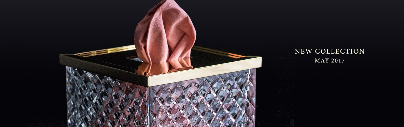 - Freestanding accessories made of solid brass, hand-blown crystal with brass fittings, and treated leather with brass (in various finishes such as 24K gold plated, chrome plated, combination of chrome and gold, satin nickel and satin chrome)