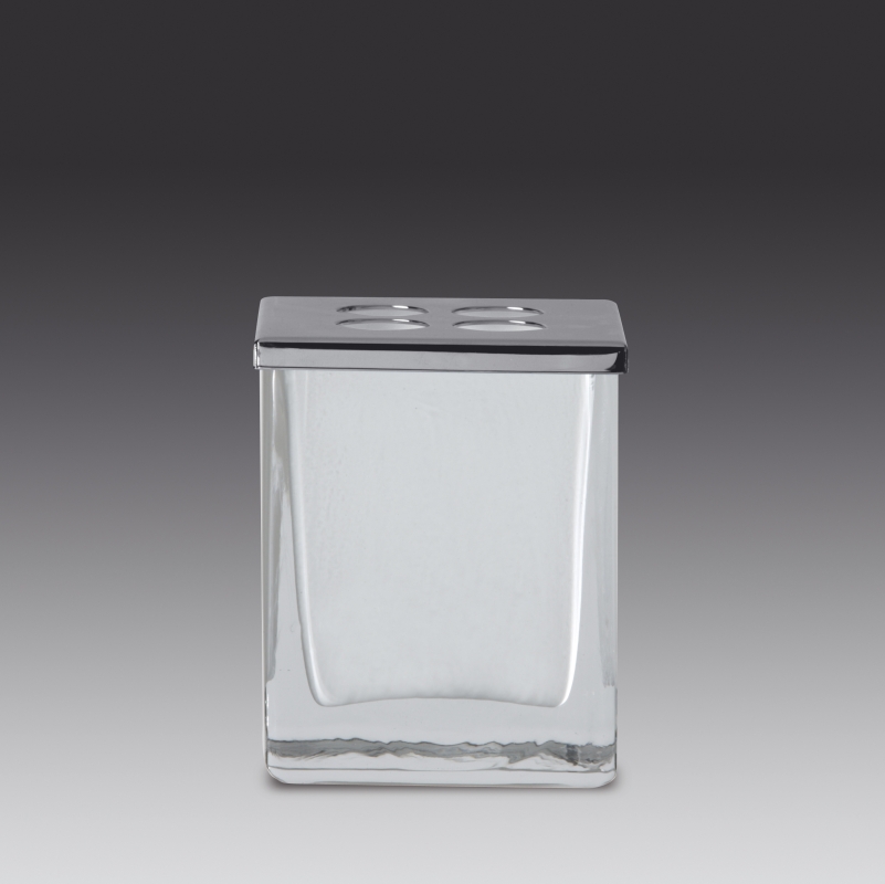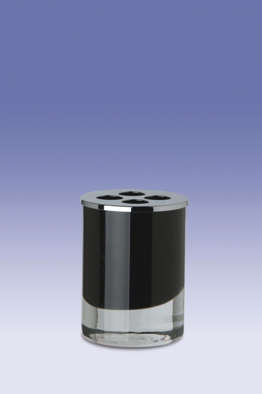 Crystal glass tooth brush holder is offered in white or black with a solid brass lid, finished in chrome and has four individual sections for keeping brushes separate.