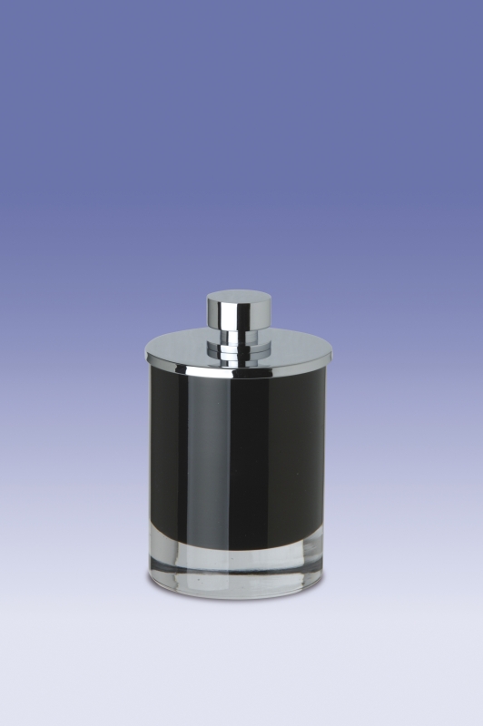 Cotton wool jar with a solid brass lid finished in chrome is available in white or black crystal.