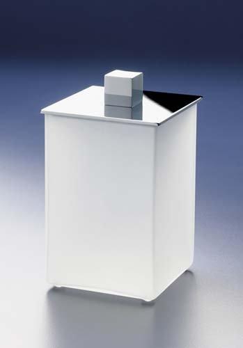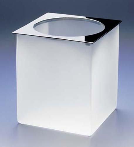 Frosted crystal glass square bath bin with a solid brass rim finished in an elegant chrome, 24 karat gold plate, a combination of chrome and 24 karat gold or satin nickel.