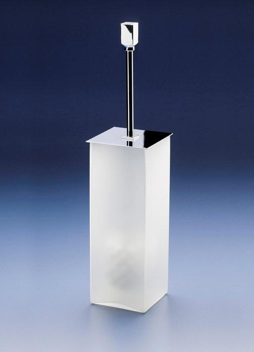 Stylish toilet brush holder made of frosted glass with a solid brass lid and brush handle that is available finished in chrome, 24 karat gold plate, satin nickel or rustic brushed brass.