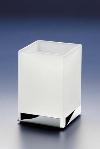 Square frosted crystal tumbler placed on a solid brass base that can be finished in chrome, rustic brushed brass or satin nickel.