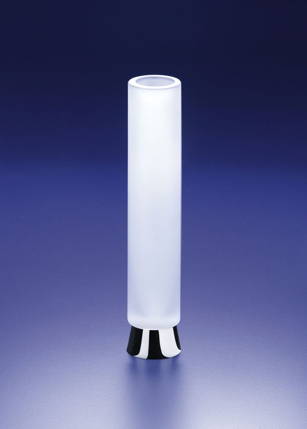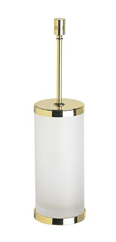 Stylish frosted glass toilet brush holder with detailing to the handle and a solid brass base and lid. Available finished in chrome, 24 karat gold plate, a combination of chrome and 24 karat gold or satin nickel.