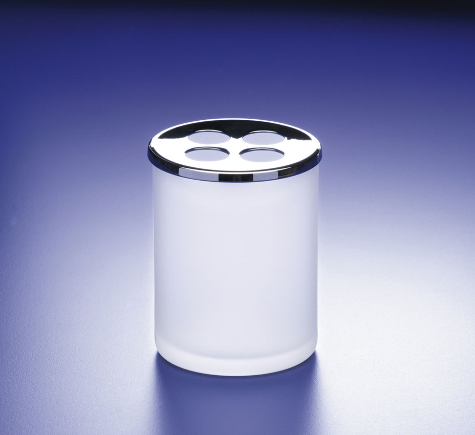 Toothbrush holder with a solid brass lid finished in polished chrome or 24 karat gold, has four compartments in the lid to keep brushes apart.