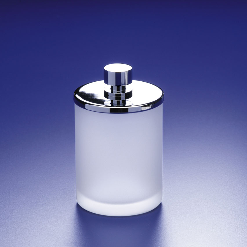 Cotton wool jar available in frosted crystal glass with a lid made of solid brass with a chrome, 24 karat gold or satin nickel finish.