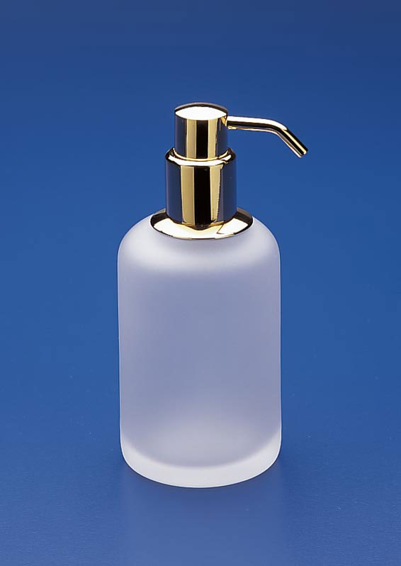 Round frosted crystal soap dispenser offered with a solid brass pump finished in chrome, 24 karat gold plate or a combination of chrome and 24 karat gold.