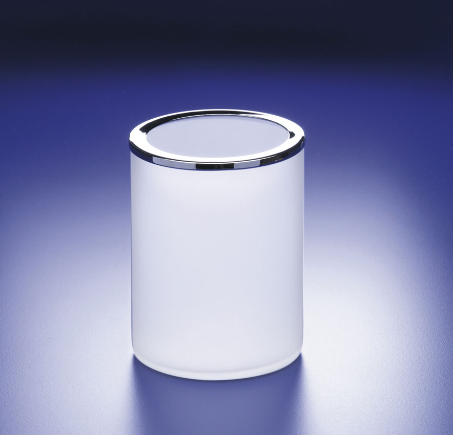 Frosted crystal bath bin with cover, decorated with a solid brass top rim and base, is available finished in chrome, 24 karat gold plate, satin nickel or a combination of chrome and 24 karat gold.