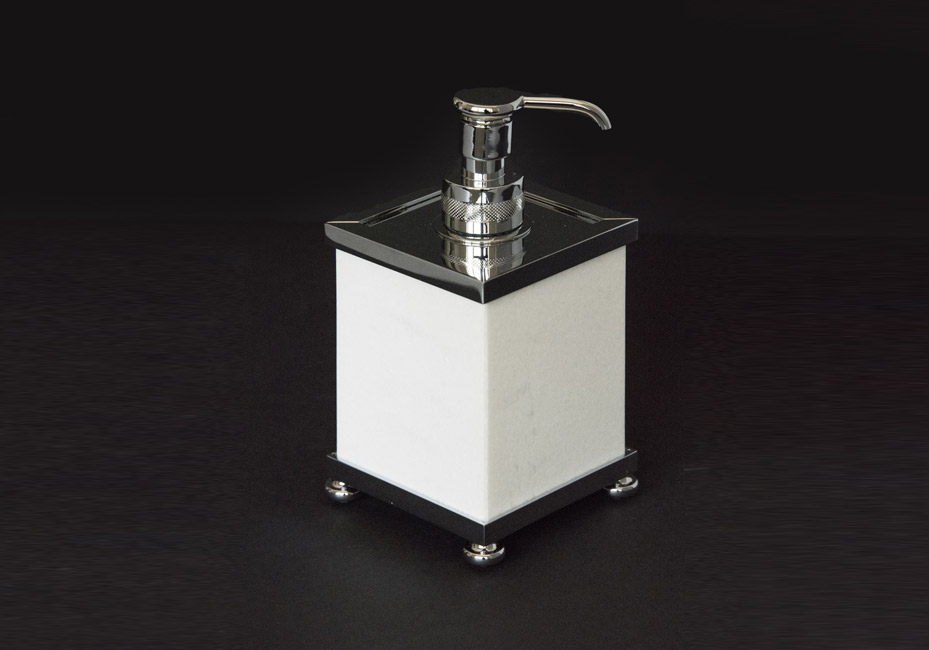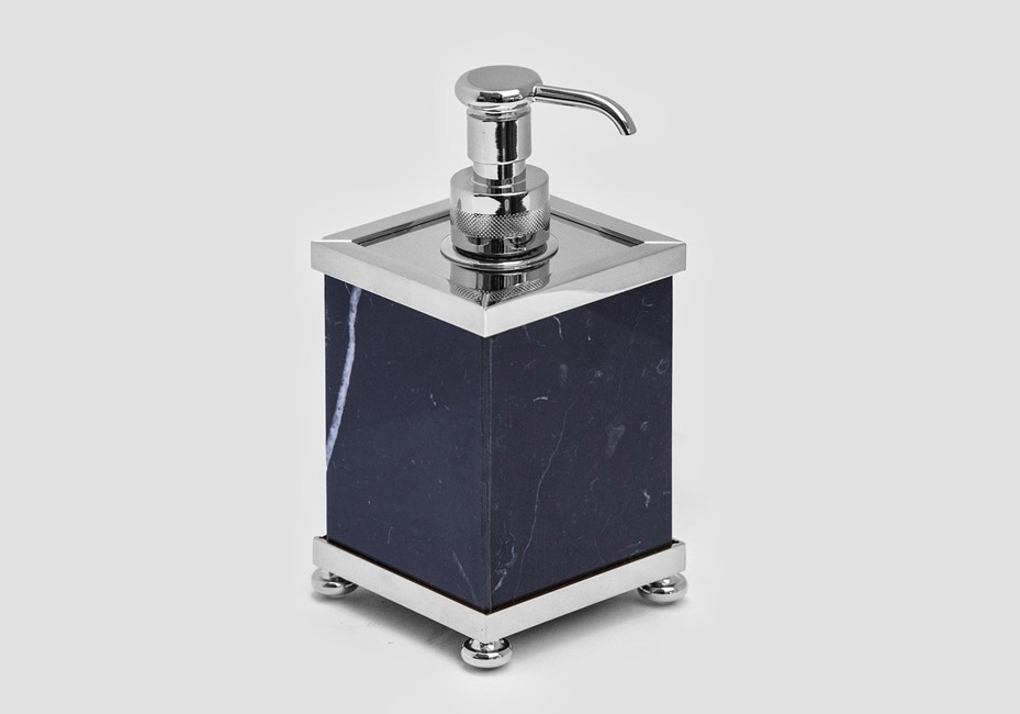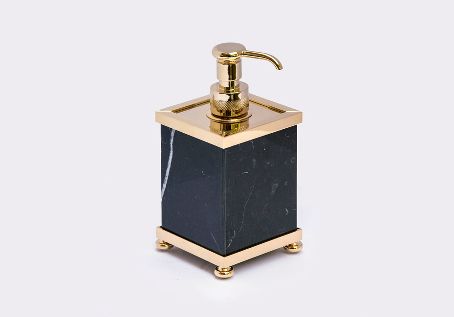 Striking soap dispenser made with luxurious black marble and featuring an exquisite, timeless design. Available in Chrome and Gold as well as bespoke finishes.