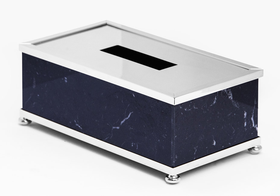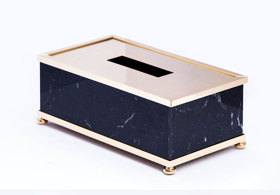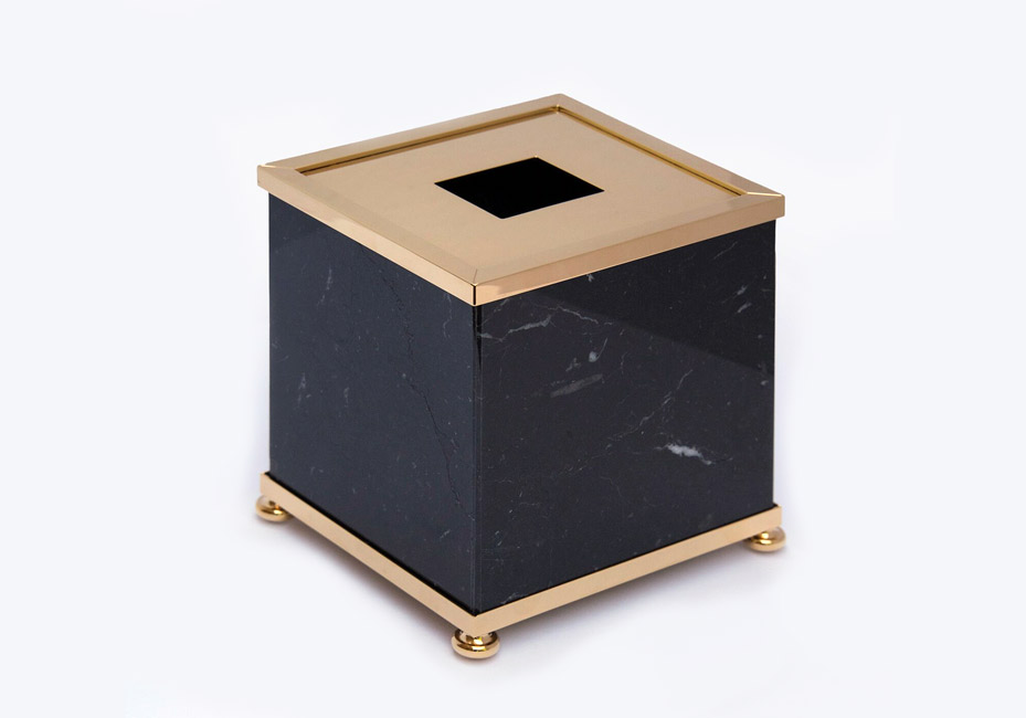 Iconic boutique tissue box made with luxurious black marble and featuring an exquisite, timeless design. Available in Chrome and Gold as well as bespoke finishes.