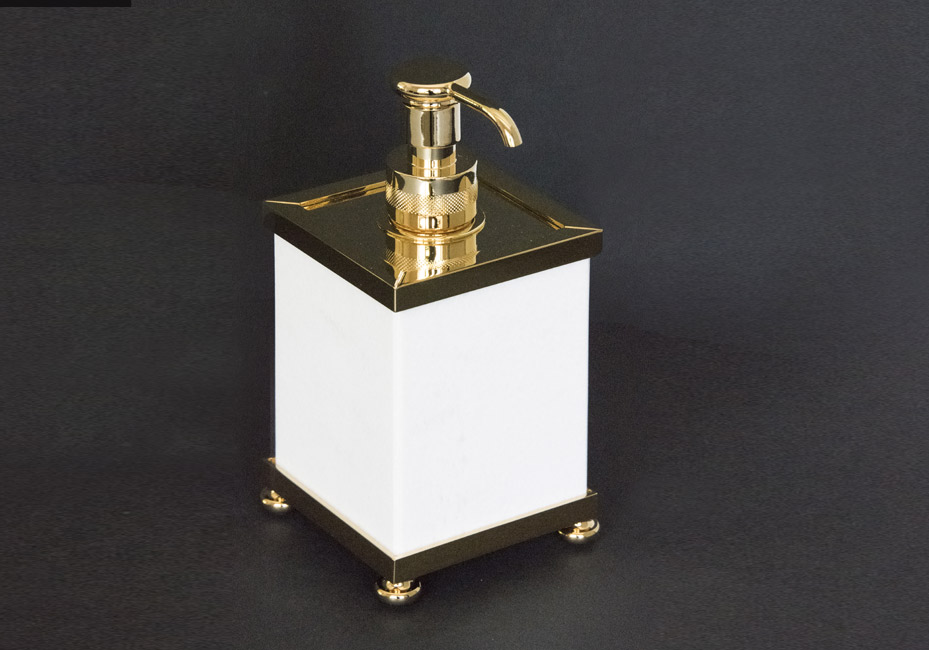 Striking soap dispenser made with luxurious white marble and featuring an exquisite, timeless design. Available in Chrome and Gold as well as bespoke finishes.