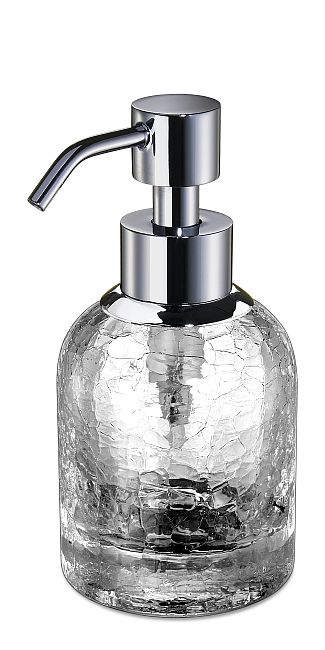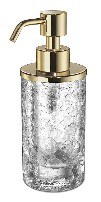 Miniature soap dispenser, crafted from eye-catching cracked crystal. The pump and fittings are crafted from solid brass and are available in chrome (90461-CR) or 24-kt gold plated finish (90461-O)