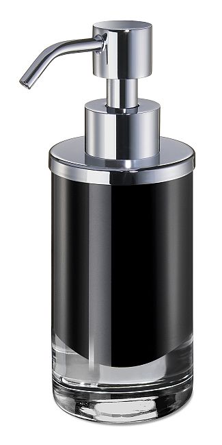 Miniature soap dispenser crafted from black crystal. The pump and fittings are made of solid brass and are available in chrome (90464-NCR) or 24-kt gold plated finish (90464-NO)