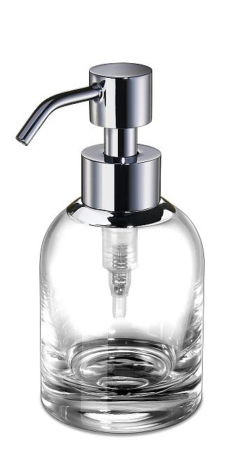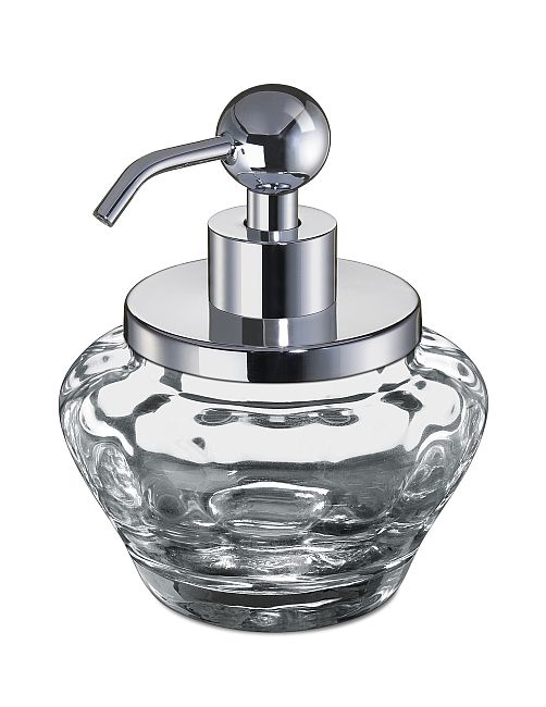 Miniature rounded soap dispenser crafted from hand blown clear crystal. The pump and fittings are made of solid brass and are available in chrome (90466-CR) or 24-kt gold plated finish (90466-O)