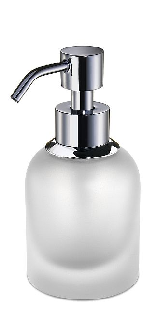 Miniature rounded soap dispenser crafted from classy translucent frosted crystal. The pump and fittings are made of solid brass and are available in chrome (90467-MCR) or 24-kt gold plated finish (90467-MO)