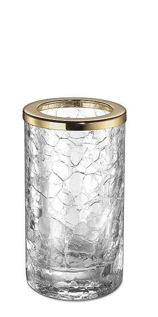Miniature brush holder is made of cracked crystal with a solid brass ring around the rim which is available in either chrome (91061-CR) or 24-kt gold plated (91061-O)