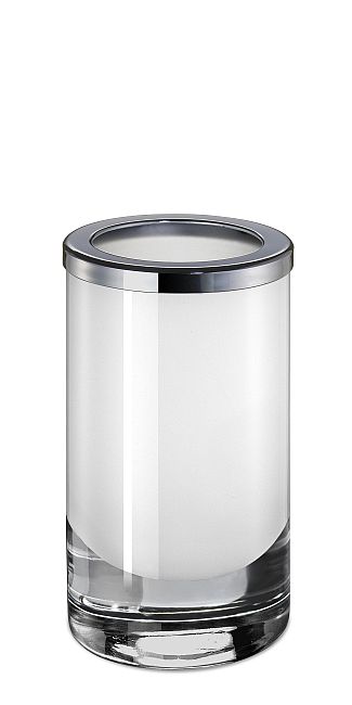Miniature brush holder is made of pure white crystal with a solid brass ring around the rim which can be plated in either chrome (91064-BCR) or 24-kt gold (91064-BO)