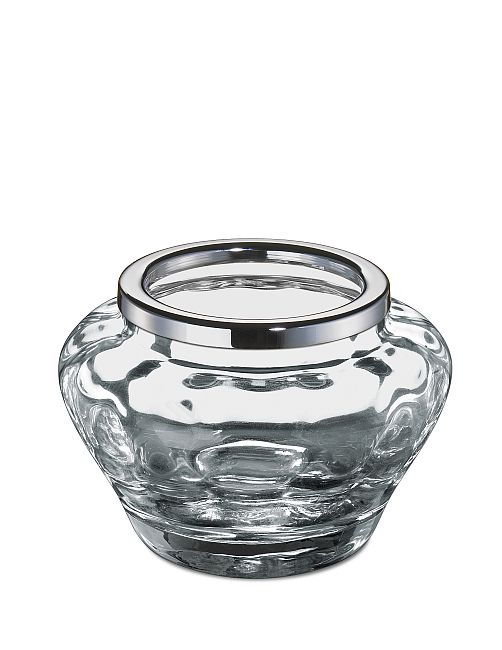 Miniature brush holder is made of clear crystal with a solid brass ring around the rim which can be plated in either chrome (91062-CR) or 24-kt gold (91062-O)