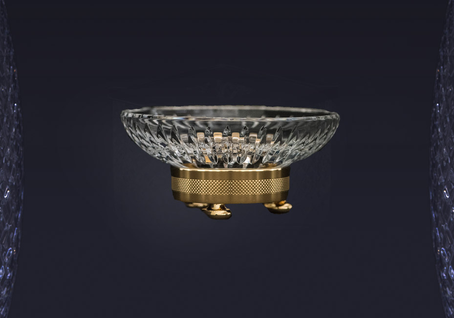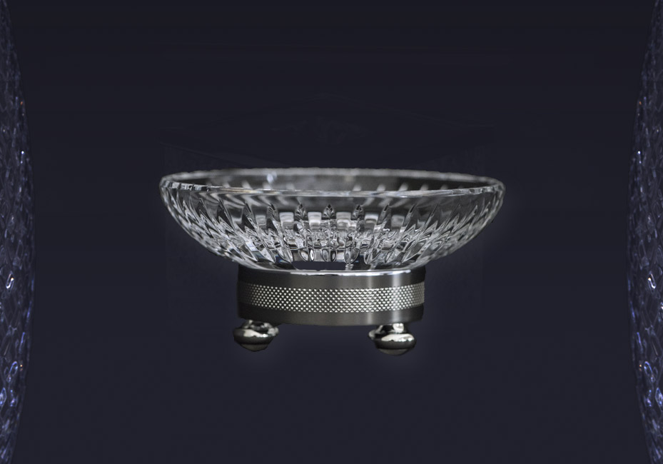 Gorgeous soap dish made of fine hand-cut crystal with decorative base immersed in 24ct gold plated finish. Available in Chrome and other bespoke finishes.