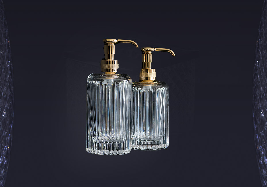 A striking, beautifully crafted luxurious soap dispenser available in variety of finishes. Pictured here in 24ct gold plated design.