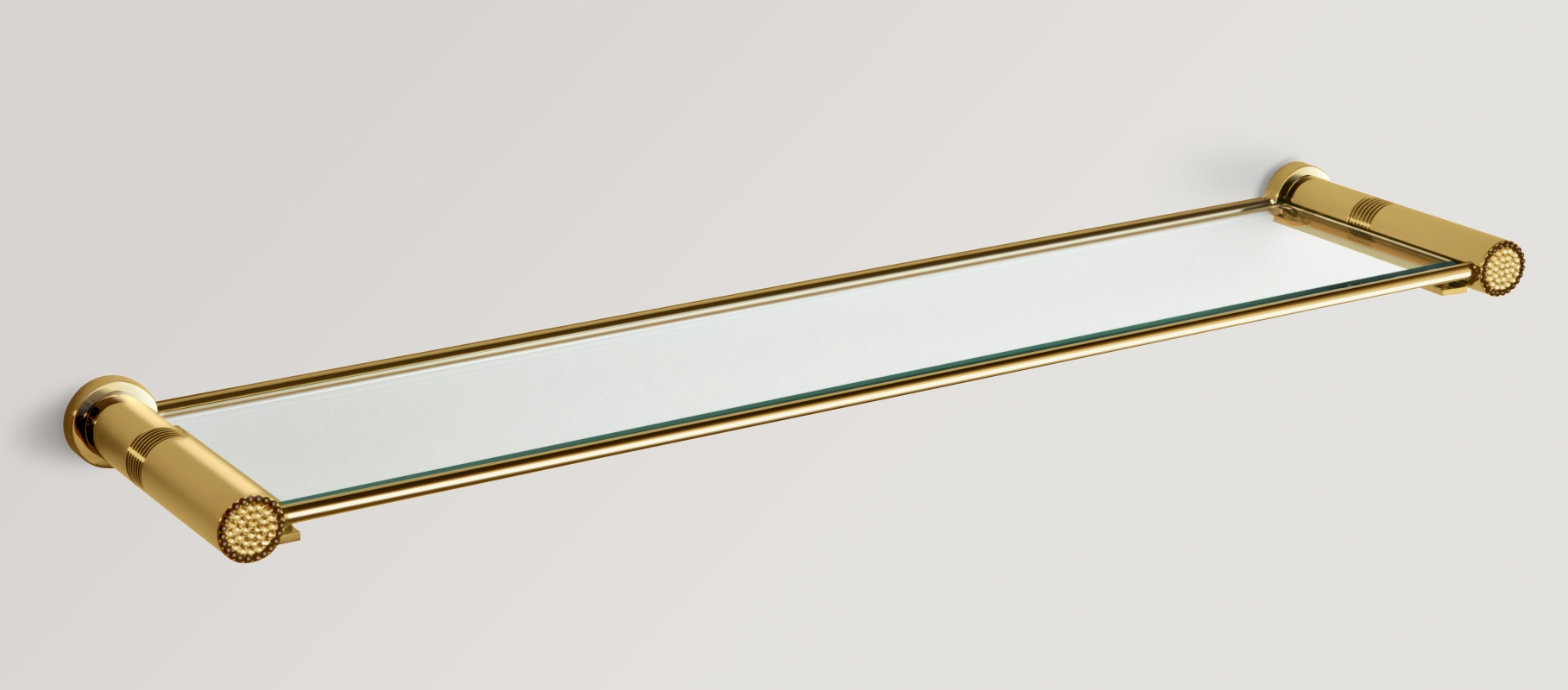 Wall Mounted glass shelf with beautiful Swarovski Crystal detailing to the brackets. Available for purchase in a Chrome or 24 Carat Gold finish.