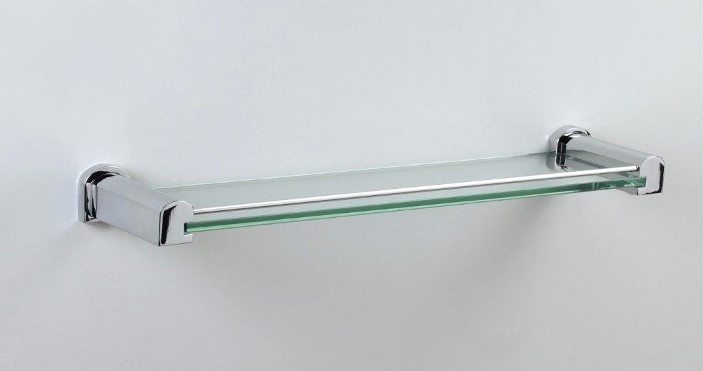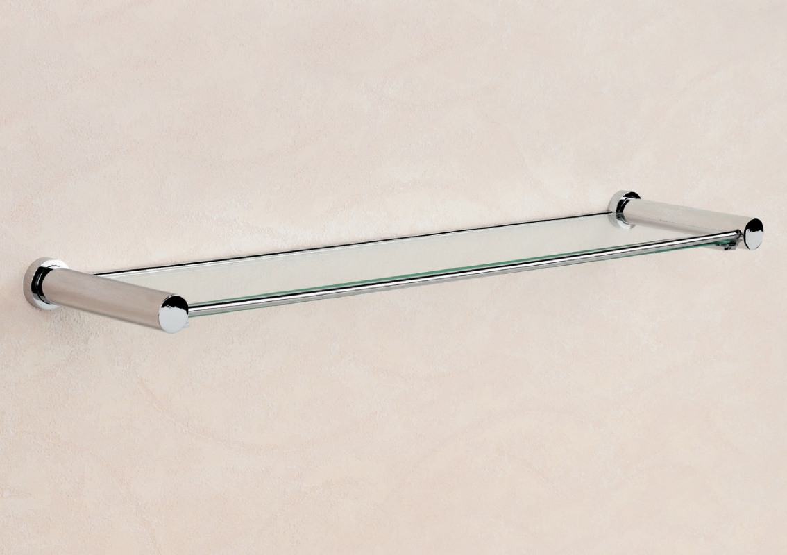 Shelf with a glass base and solid brass brackets finished in chrome, a combination of chrome and 24 carat gold or a mix of satin and chrome.