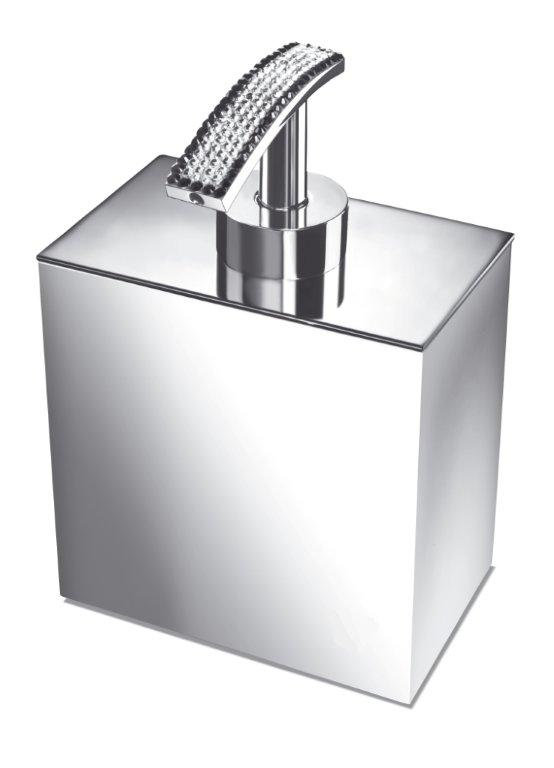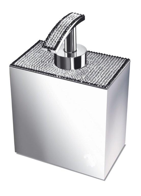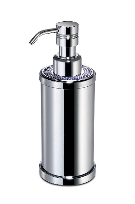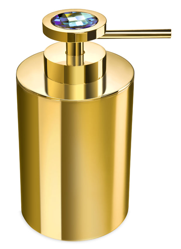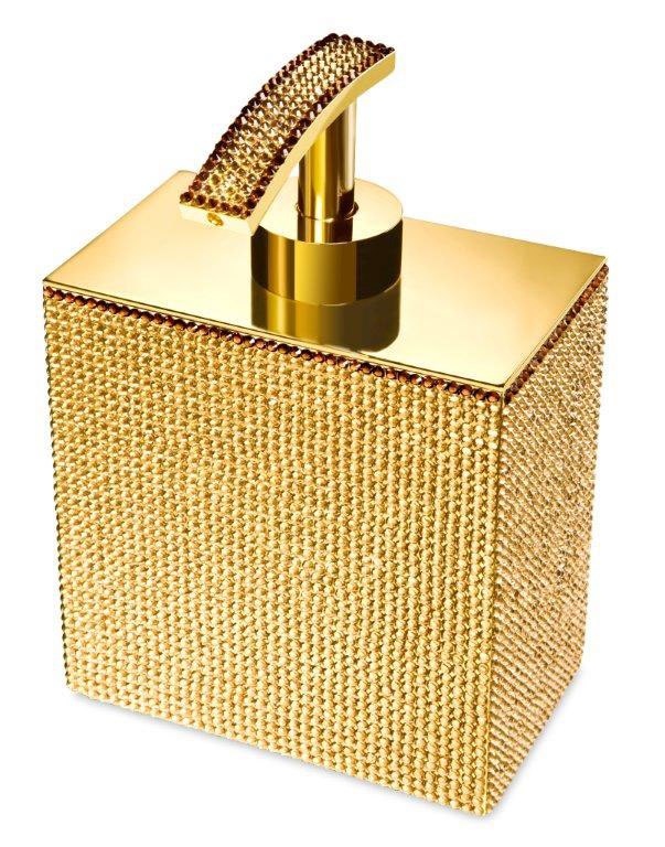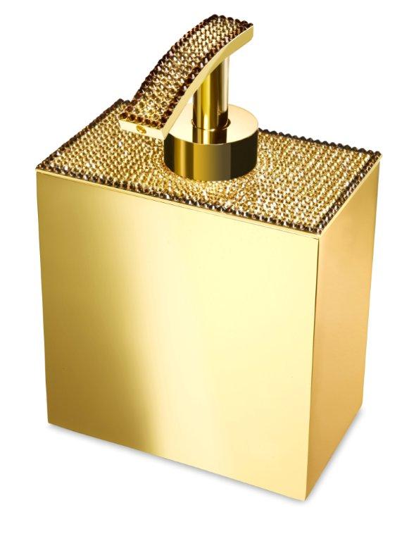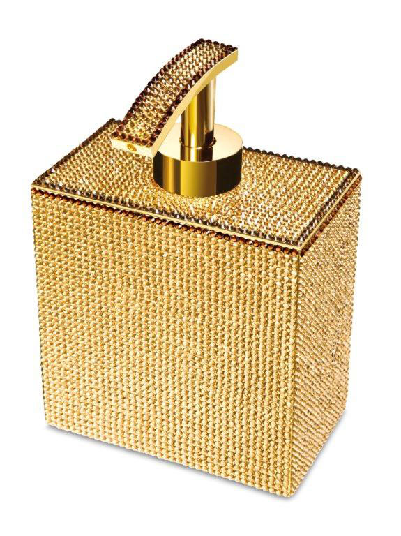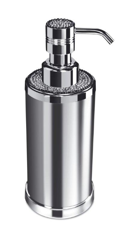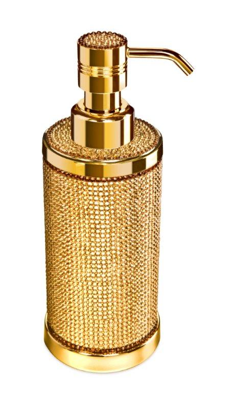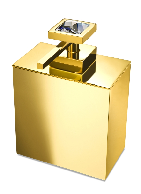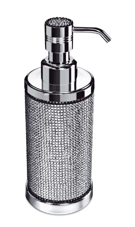 Free standing soap dispenser made of solid brass and is embedded with Swarovski crystals at the top, It is available in chrome (90615-CR) or 24k gold plated finish (90615-O). A wall mounted version is also available.