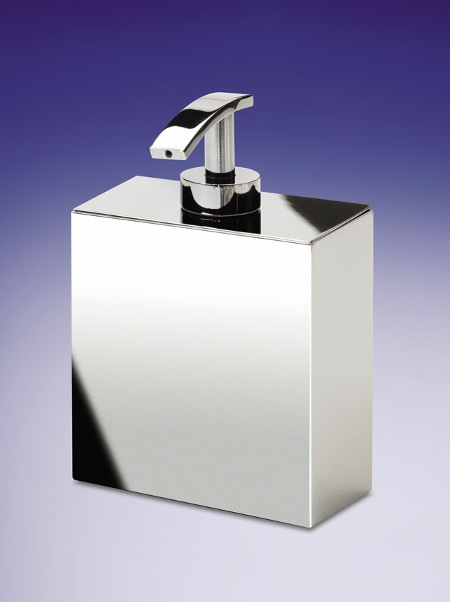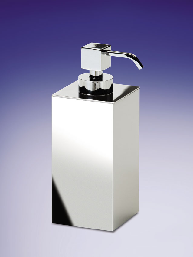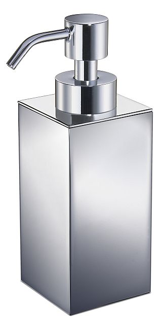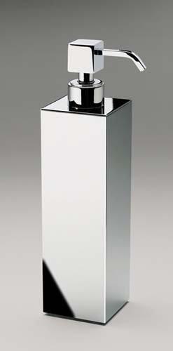 A stylish, free standing solid brass soap dispenser made in a box design is available with a chrome, satin black or satin nickel finish.