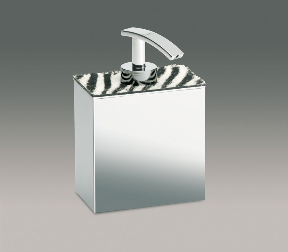 Wall mounted, rectangular soap dispenser made of solid brass, finished in chrome and decorated with a zebra pattern around the base of the pump.