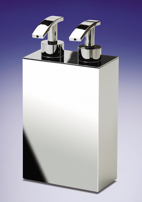 Rectangular soap dispenser with two pumps is available in a box design made of solid brass with a chrome, satin black or satin nickel finish.