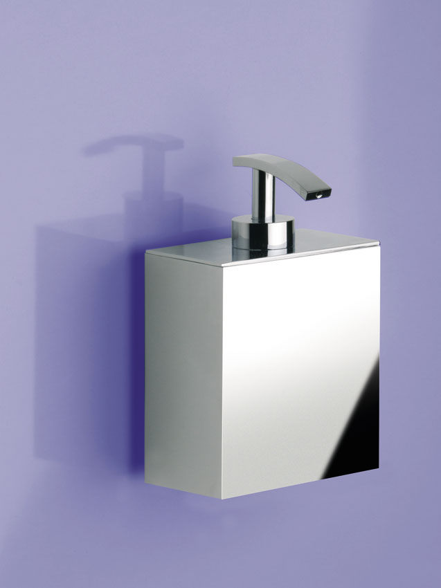 Elegant solid brass soap dispenser made in a box design is wall mountable and finished in chrome, satin black or satin nickel.