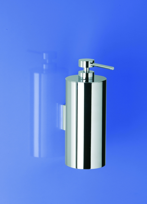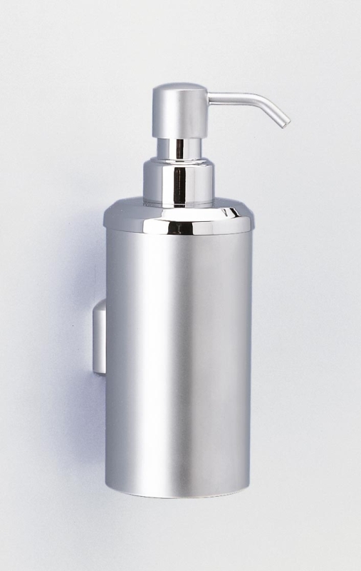 Cylinder soap dispenser made of solid brass is available in a chrome or satin nickel finish.