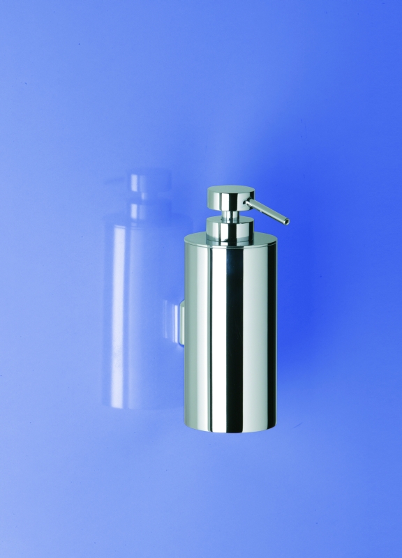 This solid brass soap dispenser with two pumps is wall mountable and available finished in chrome, satin nickel or satin black.