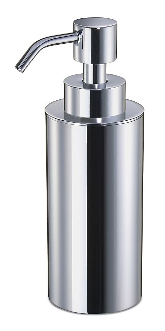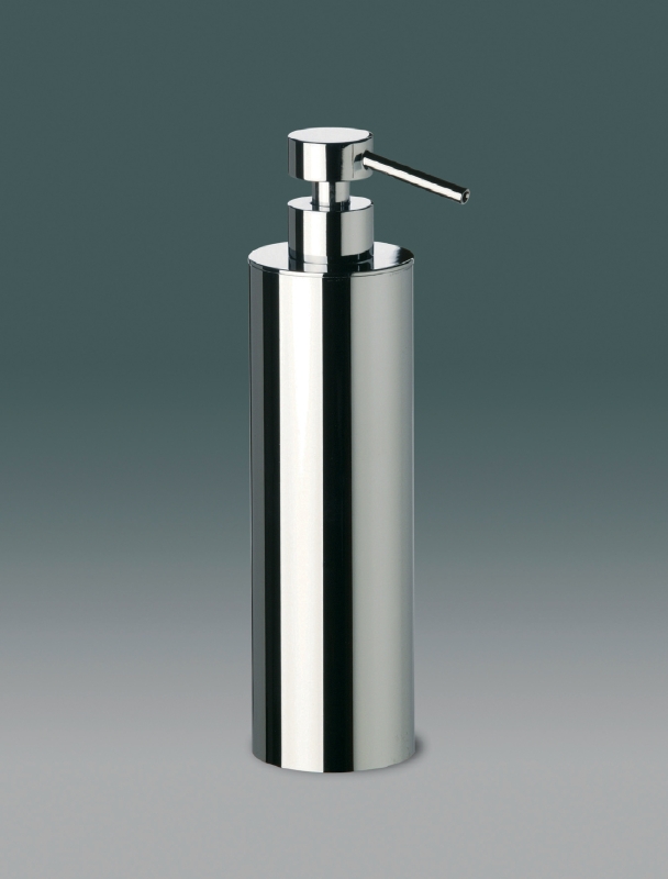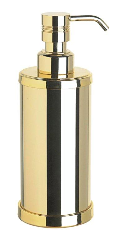 Free standing soap dispenser made of smooth solid brass and finished in chrome, rustic brushed brass (90415-OV) or satin nickel (90415-SNI).