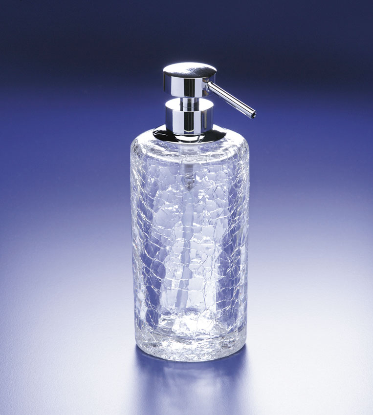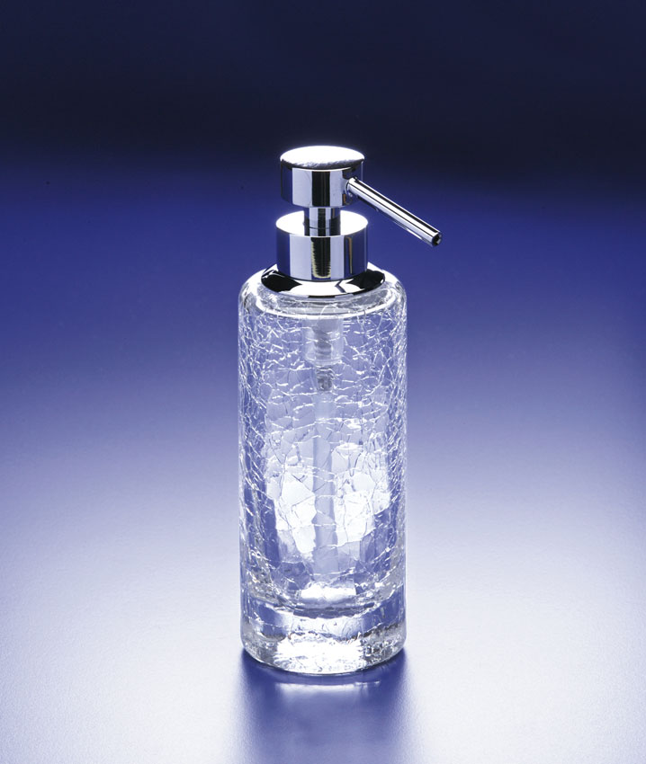 Stylish cracked crystal soap dispenser with an elegant solid brass pump finished in chrome (90414-CR), 24k gold plate (90414-O), satin nickel (90414-SNI) or rustic brushed brass (90414-OV).
