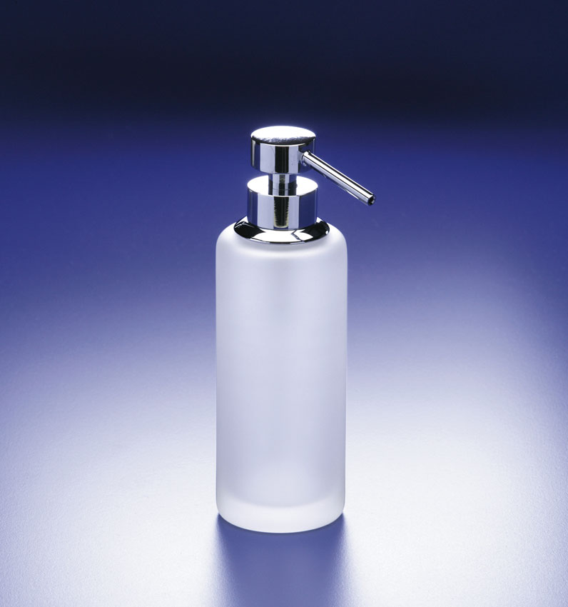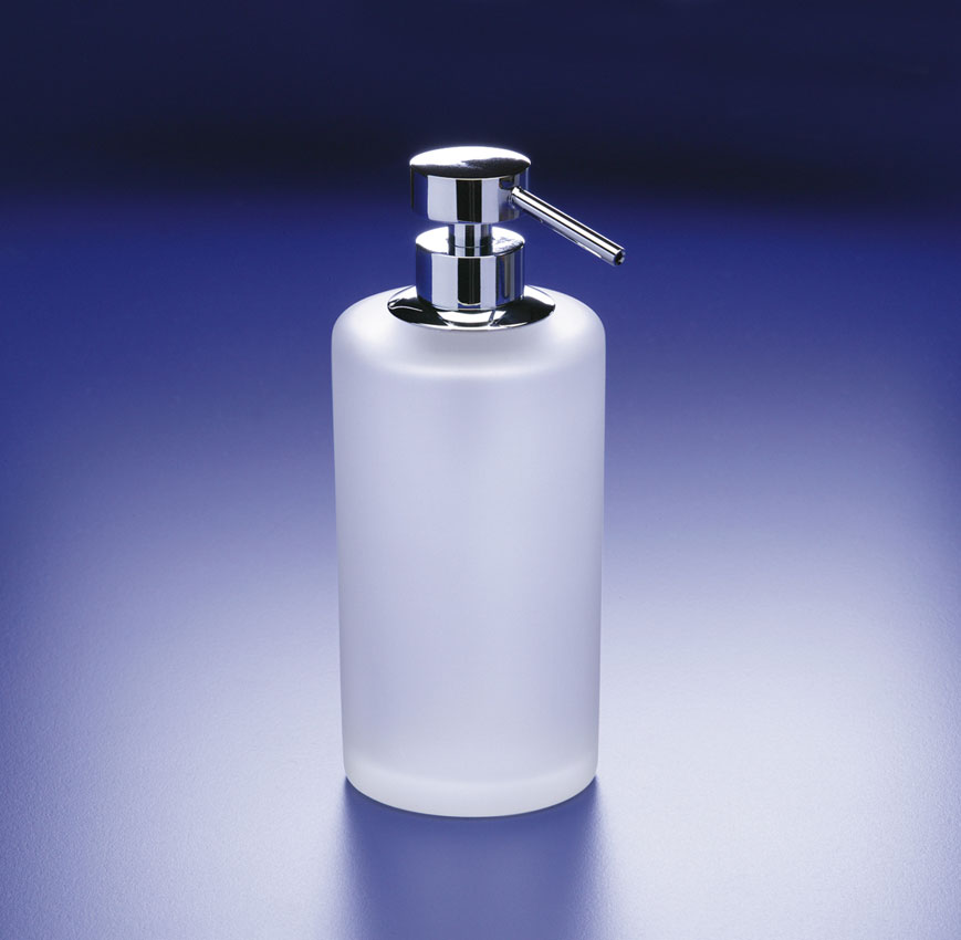 Elegantly designed frosted glass soap dispenser with a solid brass pump, available with a chrome, satin nickel or rustic brushed brass finish.