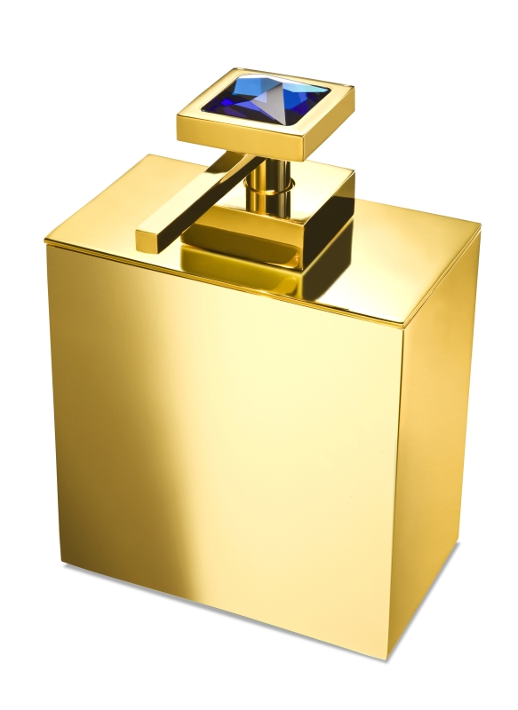 Striking rectangular liquid soap dispenser made of solid brass with a smooth 24-karat gold plated finish and decorated with a dazzling blue Swarovski crystal on top of the pump.