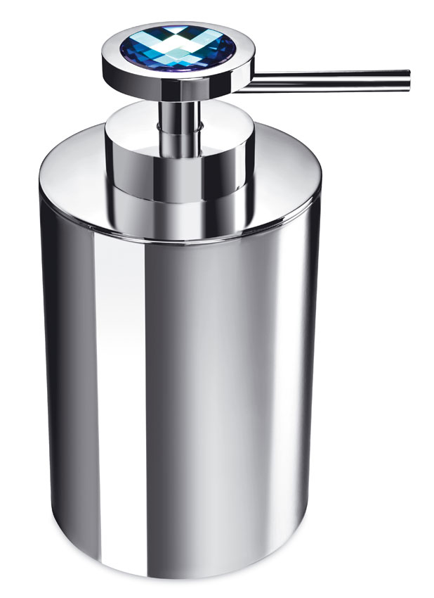 Striking cylinder liquid soap dispenser made of solid brass with a smooth polished chrome finish and elegantly decorated with a dazzling blue Swarovski crystal on top of the pump.