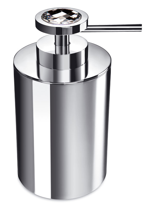 Striking cylinder liquid soap dispenser made of solid brass with a smooth polished chrome finish and elegantly decorated with a dazzling white Swarovski crystal on top of the pump