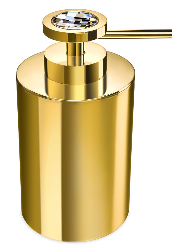 Striking cylinder liquid soap dispenser made of solid brass with a smooth 24-karat gold finish and elegantly decorated with a dazzling white Swarovski crystal on top of the pump.