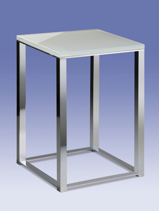 Square solid brass stool with a chrome finish is presented with an optic white glass seat.