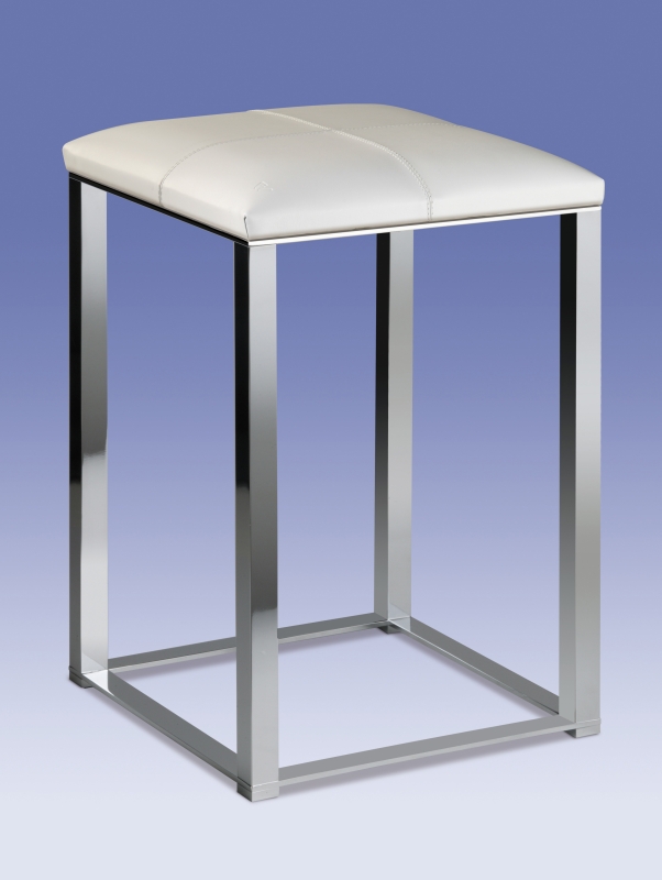 Solid brass stool in a square shape is ideal for wet environments with a cusioned seat, covered in white or black synthetic leather and finished in chrome or 24 carat gold plating.