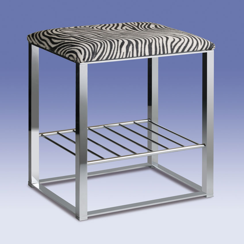 Solid brass stool in chrome is offered with a leather seat finished with a zebra design and handy towel rack beneath.