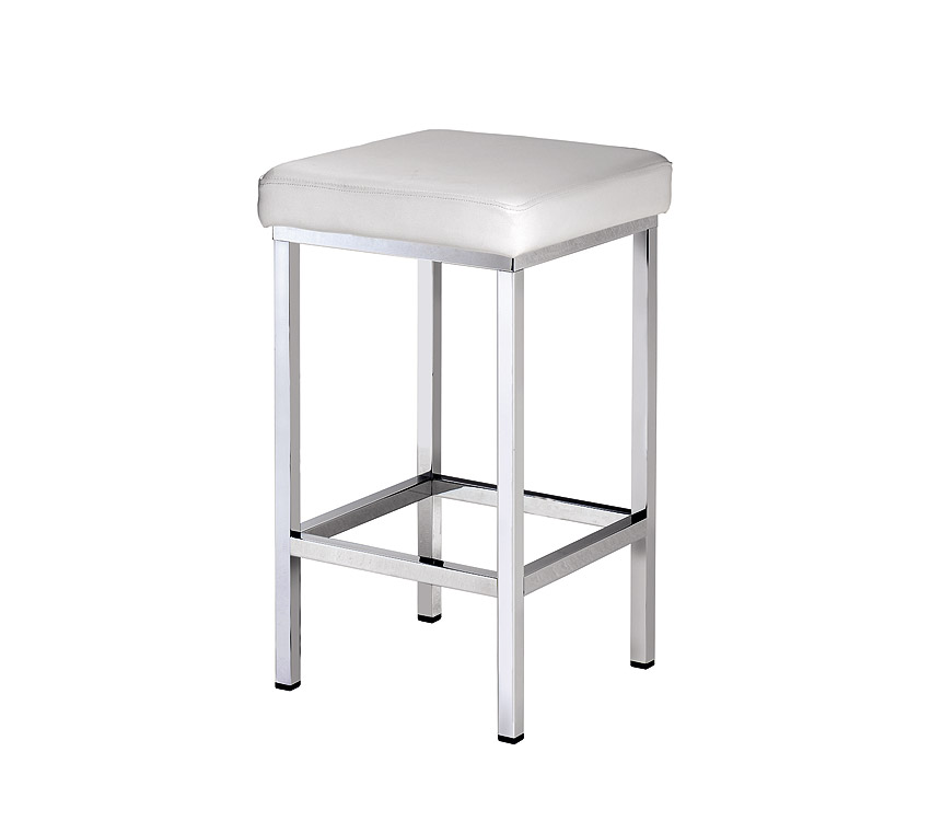 Square stool with solid brass legs finished in chrome, is presented with a cushioned white leather seat.