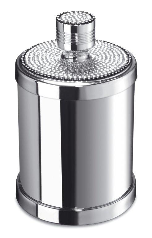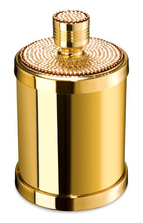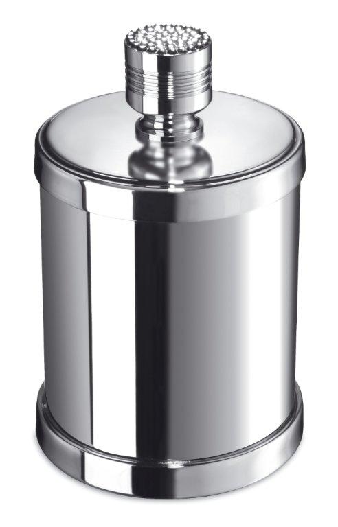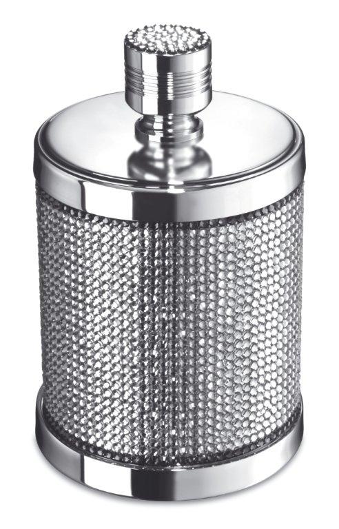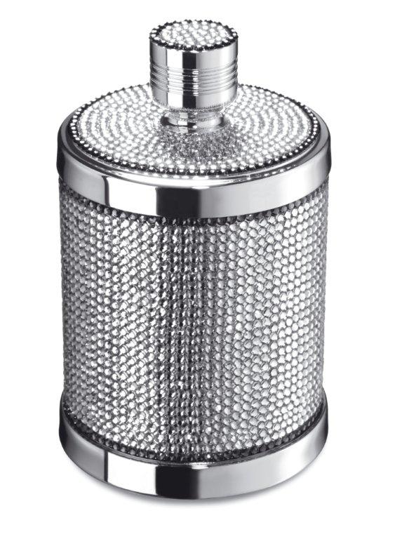 A beautifully unique round cotton bud jar that has been made of solid brass and the body and handle are both decorated by hand with Swarovski crystals by experienced Swarovski designers. Available finishes: chrome and 24 karat gold plate.