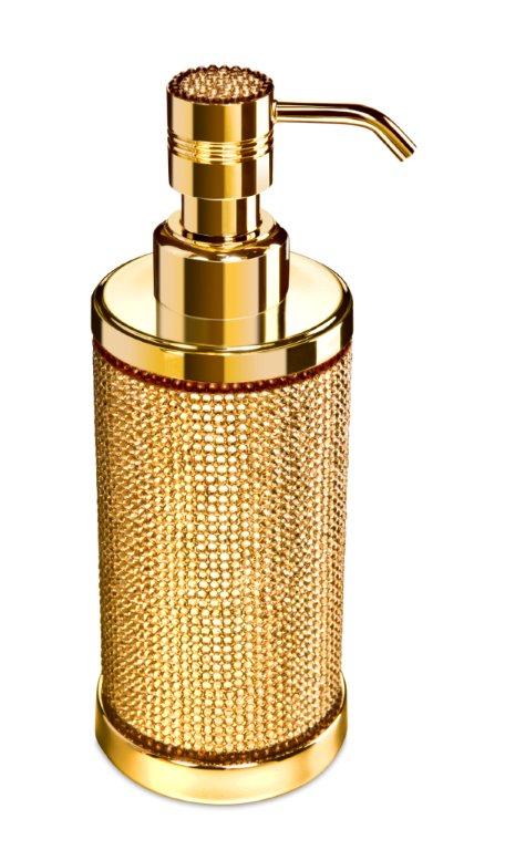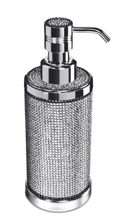 Stylish soap dispenser made of solid brass and is beautifully presented with a pump decorated in Swarovski crystals, placed by hand by experienced Swarovski designers. Available finishes: chrome and 24 karat gold plate.