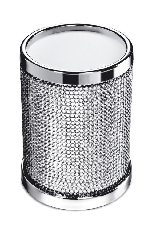 Stylish brushes holder made of solid brass has a body covered in hand placed Swarovski crystals and is available finished in polished chrome or 24 karat gold plate.