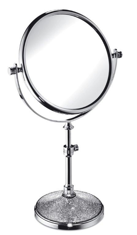 Elegant free standing table mirror made of solid brass is available in a chrome or 24 karat gold plate finish and a base beautifully covered in Swarovski crystals, hand placed by Swarovski designers.