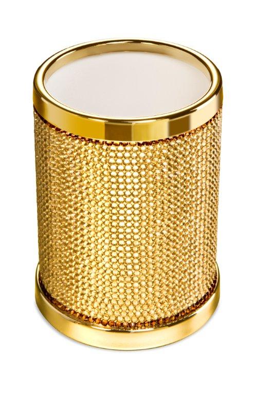 Solid brass bath bin available covered with hand placed Swarvoski crystals for an elegant appearance. Available finishes: chrome and 24 karat gold plate.