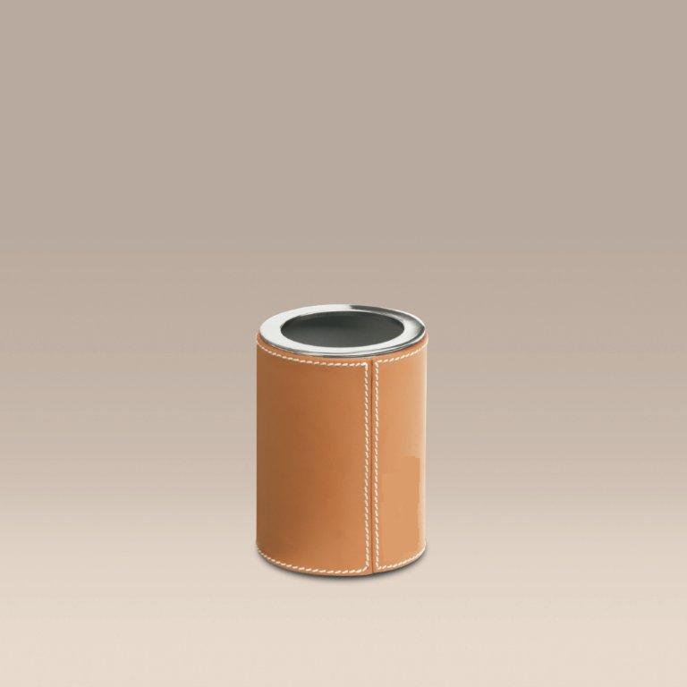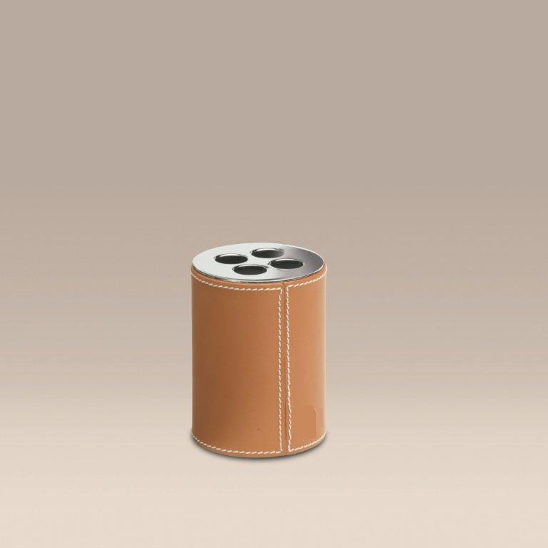 A round brushes holder made from solid brass and is presented with a covering of tan leather and a lid complete with four individual holes finished in chrome.