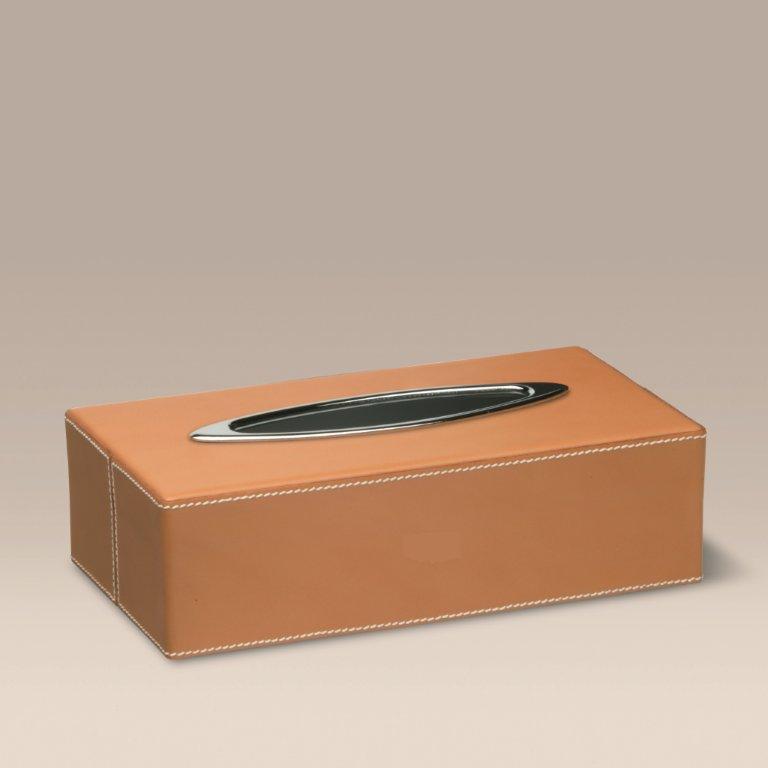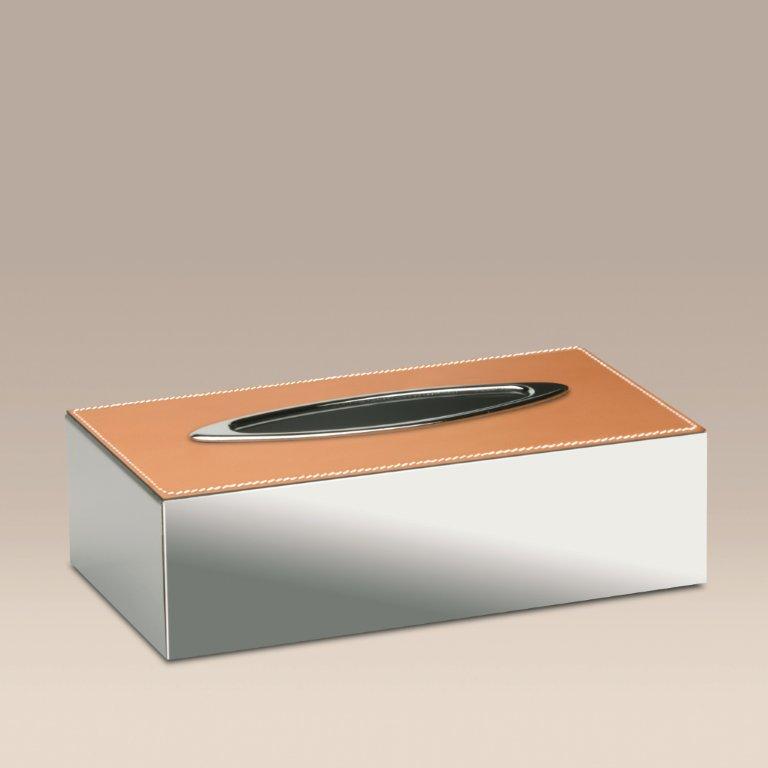 Stylish solid brass tissue box cover finished in chrome with a top face elegantly covered with tan leather.